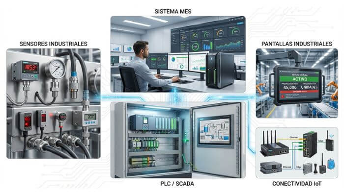 Sensores, PLC y sistemas SCADA capturan eventos en tiempo real: arranques, paradas, contadores de producción, alarmas. Esta información se envía al sistema MES cada segundo o cada pocos segundos, dependiendo de la criticidad del proceso.