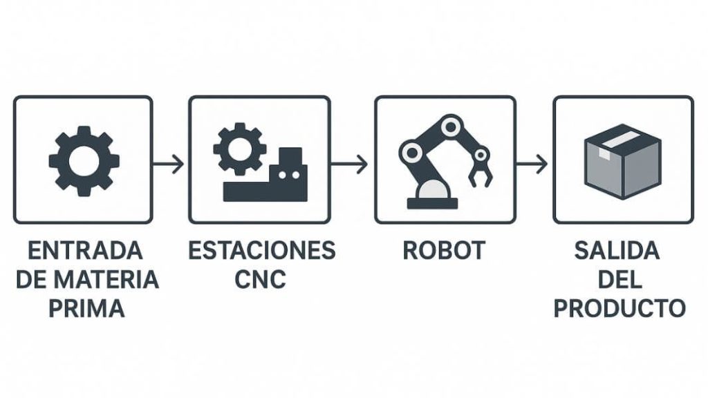 Una línea de producción automatizada es una secuencia ordenada de puestos de trabajo, máquinas CNC (control numérico por ordenador), robots, transportadores, sistemas de visión y PLC; diseñada para transformar materias primas en productos terminados de forma eficiente y uniforme.