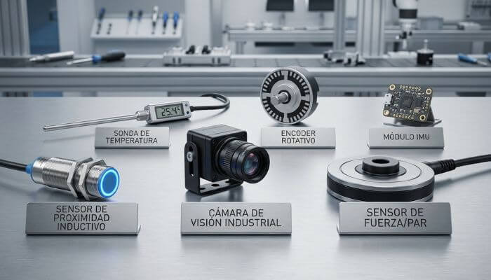 En aplicaciones colaborativas son especialmente importantes los sensores de fuerza, visión y proximidad, ya que permiten detectar presencia humana y reaccionar ante contactos inesperados.